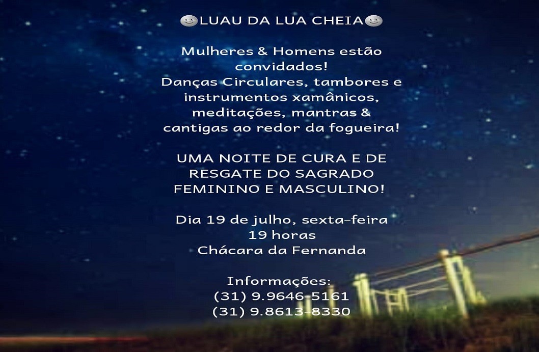 O Espaço Alta Luz vai promover na sexta-feira, dia 19, o Lual da Lua Cheia. O evento é um momento de troca de experiências, busca da cura e resgate do sagrado. Os participantes poderão levar seus instrumentos musicais, lanchinho, banquinho ou tapetinho para ficarem bem à vontade. Venha participar deste momento especial!