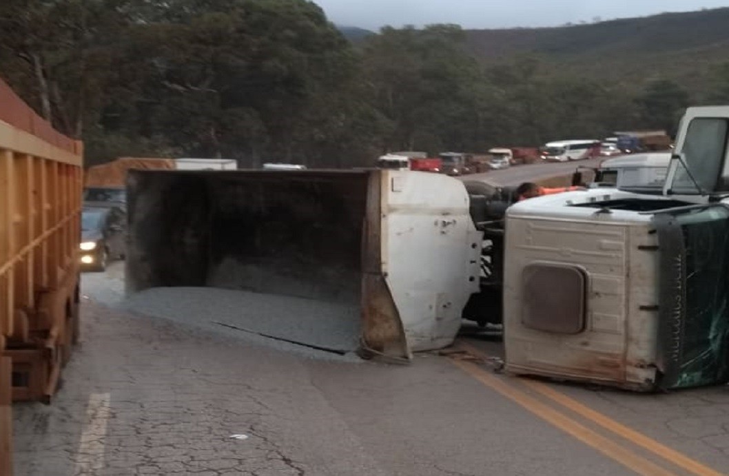 Um acidente ocorrido na manhã desta quarta-feira, dia 28, tumultua o trânsito na BR-040.Um caminhão carregado com brita tombou no km 583, entre o restaurante Mirante da Serra e Celinha.