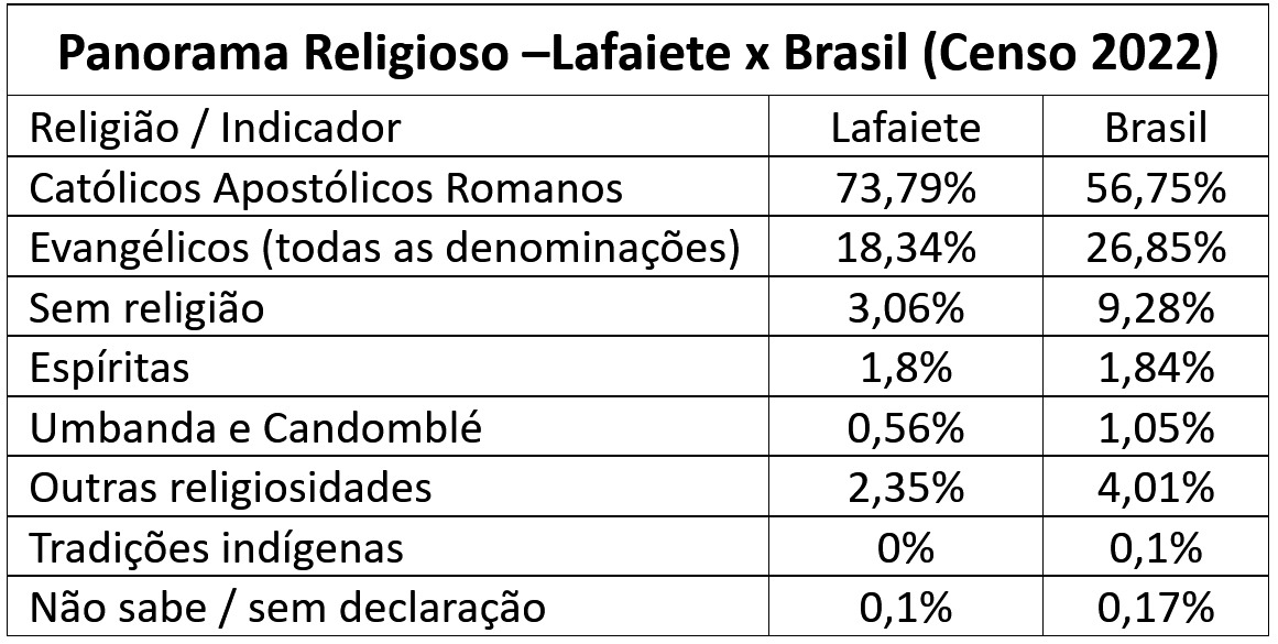 Os dados divulgados pelo IBGE em junho mostram que Lafaiete mantém uma configuração religiosa mais tradicional que a média nacional, com predominância católica acima dos índices brasileiros. Quando ouvidas no Censo 2022, 85.816 pessoas declararam-se católicas apostólicas romanas, o que representa 73,79% da população. No Brasil, esse índice é de 56,7%, mais de 17,9 pontos percentuais abaixo da taxa municipal. Embora o Censo 2022 mostre uma queda importante do catolicismo no cenário nacional (com redução de 8,4 pontos percentuais (p.p.) em relação a 2010), não há, nos dados disponíveis na plataforma, um recorte específico que permita medir essa variação ao longo do período em Lafaiete.