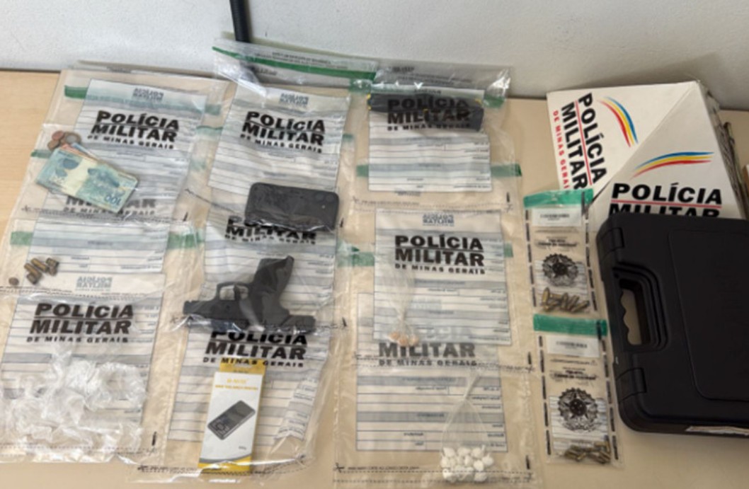 Na madrugada desta quarta-feira, 17 de setembro, a Polícia Militar de Cristiano Otoni apreendeu uma pistola calibre 9mm, três carregadores, diversas munições de calibres variados, além de 15 papelotes de cocaína, três pedras de crack e a quantia de R$ 403,50. O material foi localizado em um armário de uso particular, durante diligências realizadas no bairro Pinheiros.
