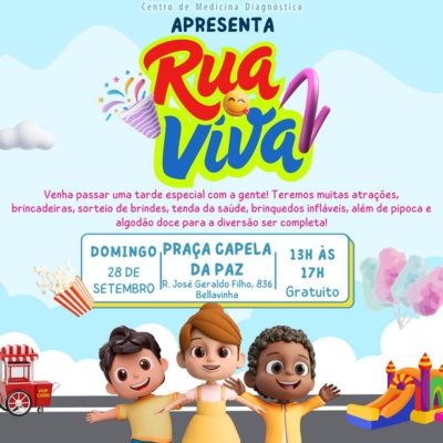 Anote na agenda: das 13h às 17h do domingo, 28 de setembro, a Praça da Capela da Paz, em Lafaiete, receberá o Projeto Rua Viva. Promovido pela Ekosom – Centro de Medicina Diagnóstica, o evento retorna para sua segunda edição ainda mais vibrante, reunindo cultura, saúde e diversão em um programa feito para toda a família. As atrações incluem brinquedos infláveis para as crianças, pipoca e algodão-doce, apresentações artísticas e diversas brincadeiras. “É o tipo de encontro que transforma o espaço público em quintal coletivo, em lugar de vizinhança e de pertencimento”, detalham os organizadores.