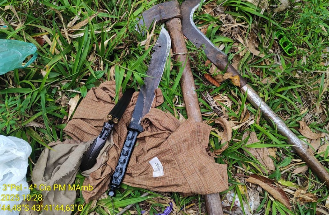 A guarnição, composta pelos sargentos Edegar, Flausino e Diogo, também encontrou sinais de corte de árvores esparsas na área protegida. No entanto, não foi possível identificar suspeitos no local. A ocorrência foi registrada no REDS 2025-053078443-001, referente a infrações contra a incolumidade e a paz pública. Materiais apreendidos: 1 arma de fogo; 2 munições intactas; 1 facão; 1 machado; 1 foice. Os materiais foram encaminhados para as autoridades competentes, e as ações de fiscalização na ReBio continuarão para prevenção de crimes ambientais.