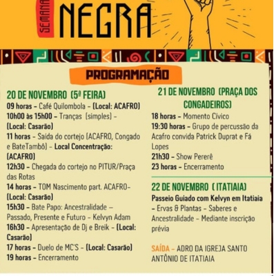 Tags: Consciência Negra; Ouro Branco MG; Cultura afro-brasileira; Semana da Consciência Negra; Programação cultural