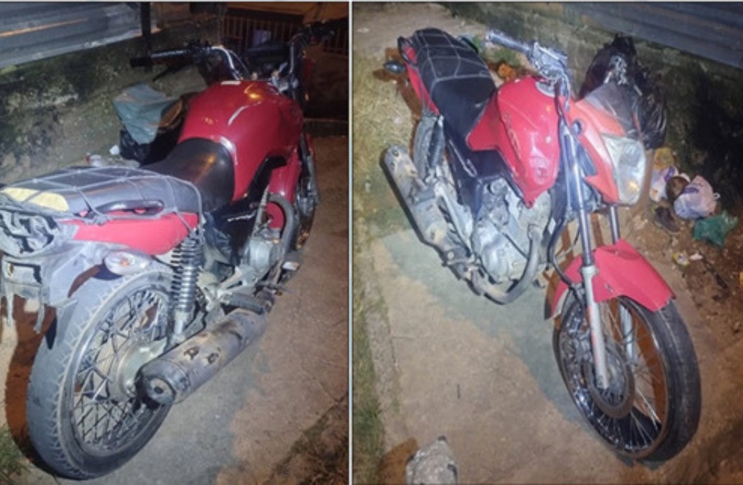 Durante as diligências, os militares confirmaram as suspeitas e localizaram a motocicleta vermelha, que estava sem placa de identificação e apresentava chassi e numeração do motor suprimidos, indícios comuns em veículos oriundos de crimes.