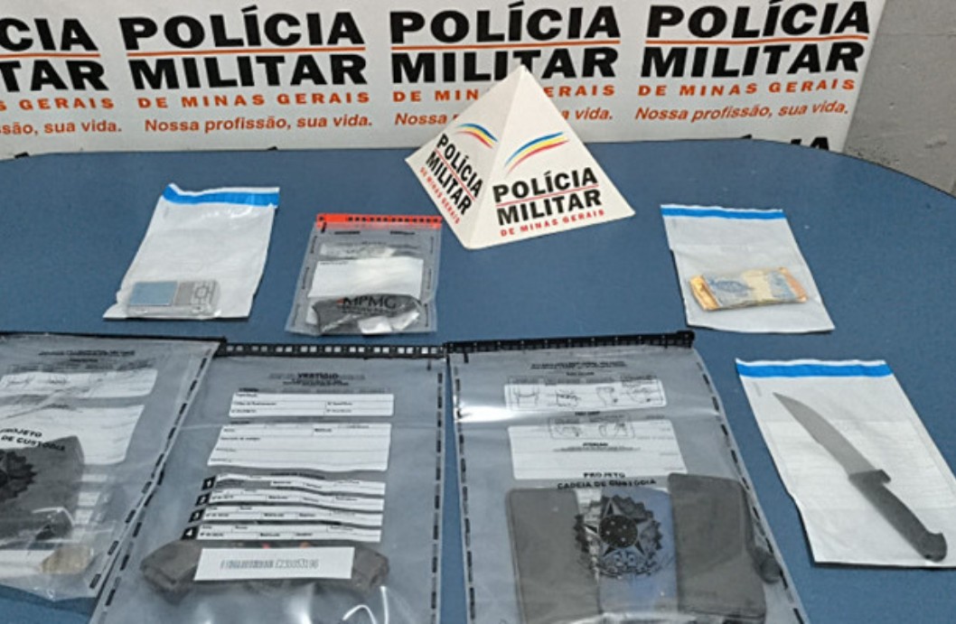 Tags: Carandaí; Polícia Militar de Minas Gerais; tráfico de drogas; maconha; cocaína; simulacro de arma; abordagem policial; prisão em flagrante; drogas em MG; segurança pública