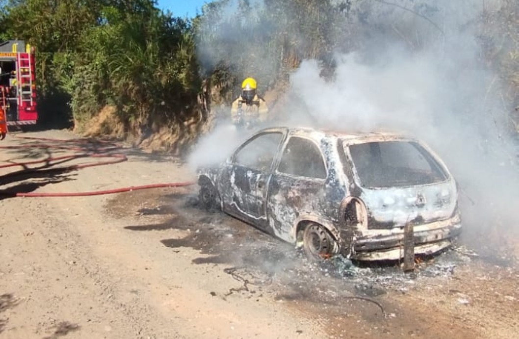 Ao chegarem ao local, os bombeiros constataram que o veículo já estava em chamas e que o incêndio começava a atingir a área de mata ao redor