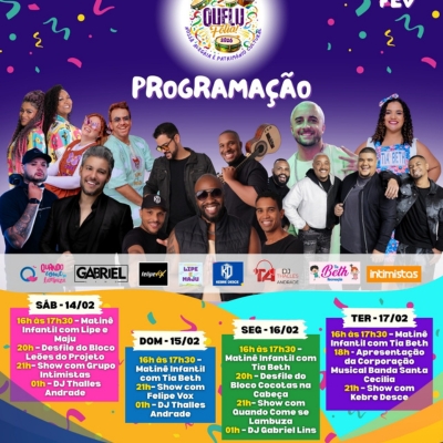 O Carnaval de Queluzito entra em 2026 com um novo status e programação oficial definida. Reconhecida como Patrimônio Cultural Imaterial do Município, a tradicional festa será realizada entre os dias 14 e 17 de fevereiro, reunindo atrações musicais, desfiles de blocos tradicionais e atividades voltadas a públicos de todas as idades, fortalecendo a cultura popular e a identidade local. Batizado de Quelu Folia 2026, o evento contará com quatro dias de programação concentrada no centro da cidade. No sábado, dia 14, a abertura acontece com a Matinê Infantil, das 16h às 17h30, comandada por Lipe e Maju. À noite, a programação segue com o desfile do Bloco Leões do Projeto, às 20h, show da banda Intimistas, às 21h, e apresentação do DJ Thalles Andrade, a partir da 1h.
