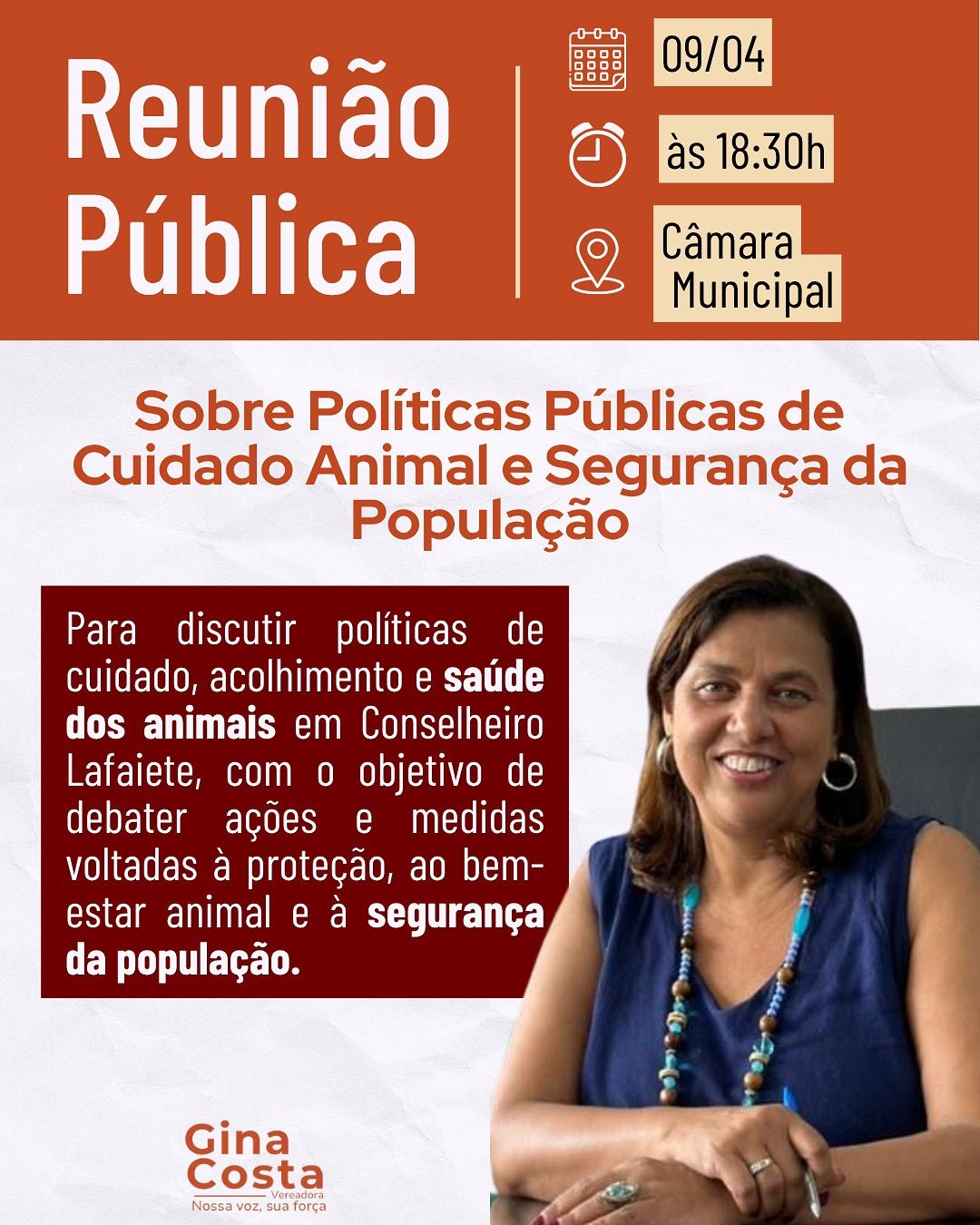 Para a vereadora Gina Costa, o tema exige sensibilidade e responsabilidade: “Precisamos tratar essa questão com equilíbrio. Cuidar dos animais é fundamental, mas também é nosso dever garantir a segurança das pessoas. A reunião pública será um espaço importante para ouvir todos os envolvidos e construir soluções que contemplem essas duas dimensões.”
