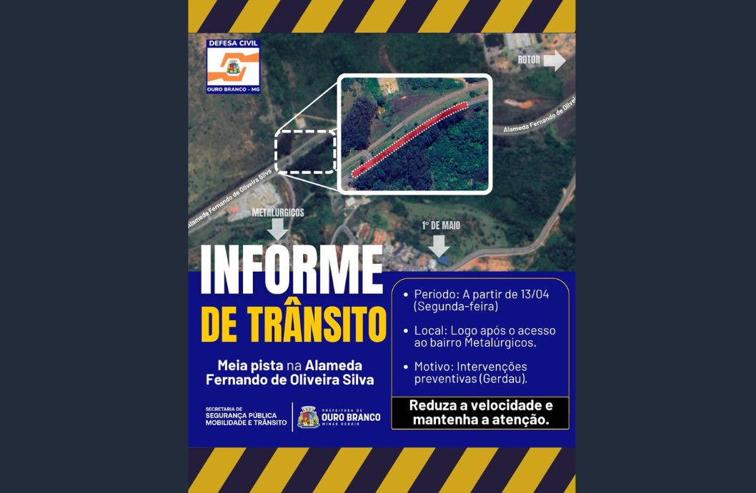 A secretaria municipal de Segurança Pública, Mobilidade e Trânsito de Ouro Branco, em conjunto com a Defesa Civil, informou que a partir desta segunda-feira, dia 13, o trânsito na Alameda Fernando de Oliveira Silva, após o acesso ao bairro Metalúrgicos, passará a operar em sistema de meia pista.A alteração será necessária para a realização de obras de manutenção e intervenções preventivas executadas pela Gerdau. Durante os trabalhos, haverá movimentação de máquinas e presença de operários no local.