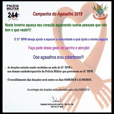 Um gesto de amor e solidariedade pode transformar e aquecer muitas vidas. Foi pensando nisso, que o 31º Batalhão de Polícia Militar iniciou nesta semana, a Campanha do Agasalho. A ação vai arrecadar agasalhos e cobertores para ajudar as pessoas que mais precisam, nas noites frias de inverno. As doações poderão ser recolhidas, até o dia 21 de junho, na sede do 31º BPM, que fica situado na avenida Monsenhor Moreira, 555, São Sebastião ou nas unidades que pertencem o Batalhão. A entrega dos donativos está prevista para o dia 24 de junho.
