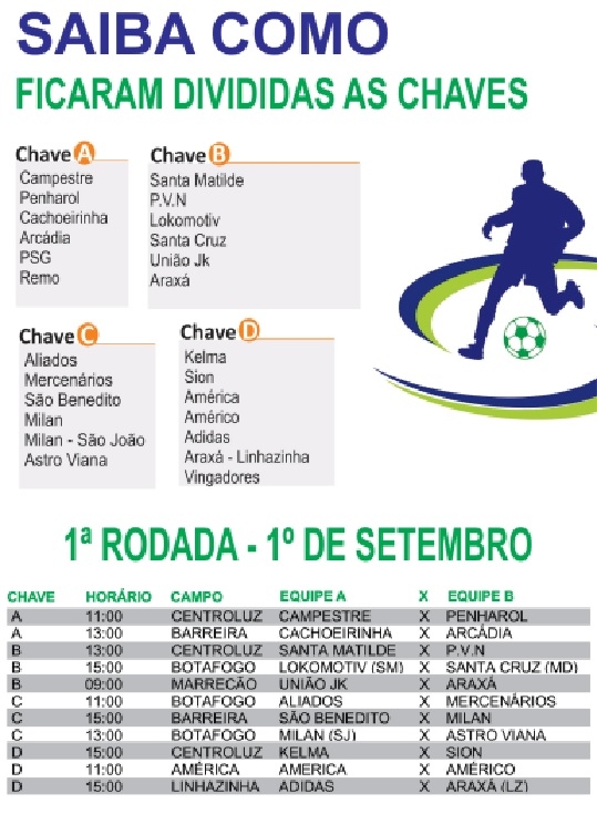Segundo os organizadores, um time desistiu da competição e foi necessário reorganizar as chaves: “A Secretaria Municipal de Esportes e Lazer comunica que a equipe Lokomotiv – Santa Maria, solicitou sua exclusão da XXIII Copa Lafaiete Varzeana. Diante do fato, a organização da Copa se viu obrigada a reformular as chaves da competição”, informaram. Confira como ficou a nova tabela do campeonato.