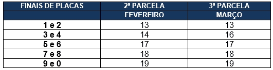 A segunda parcela do Imposto sobre a Propriedade de Veículos Automotores (IPVA) 2020 começa a vencer nesta quinta-feira (13/2), em Minas Gerais, para veículos com finais de placa 1 e 2. A escala segue até o dia 19/2, se encerrando com os finais de placa 9 e 0.