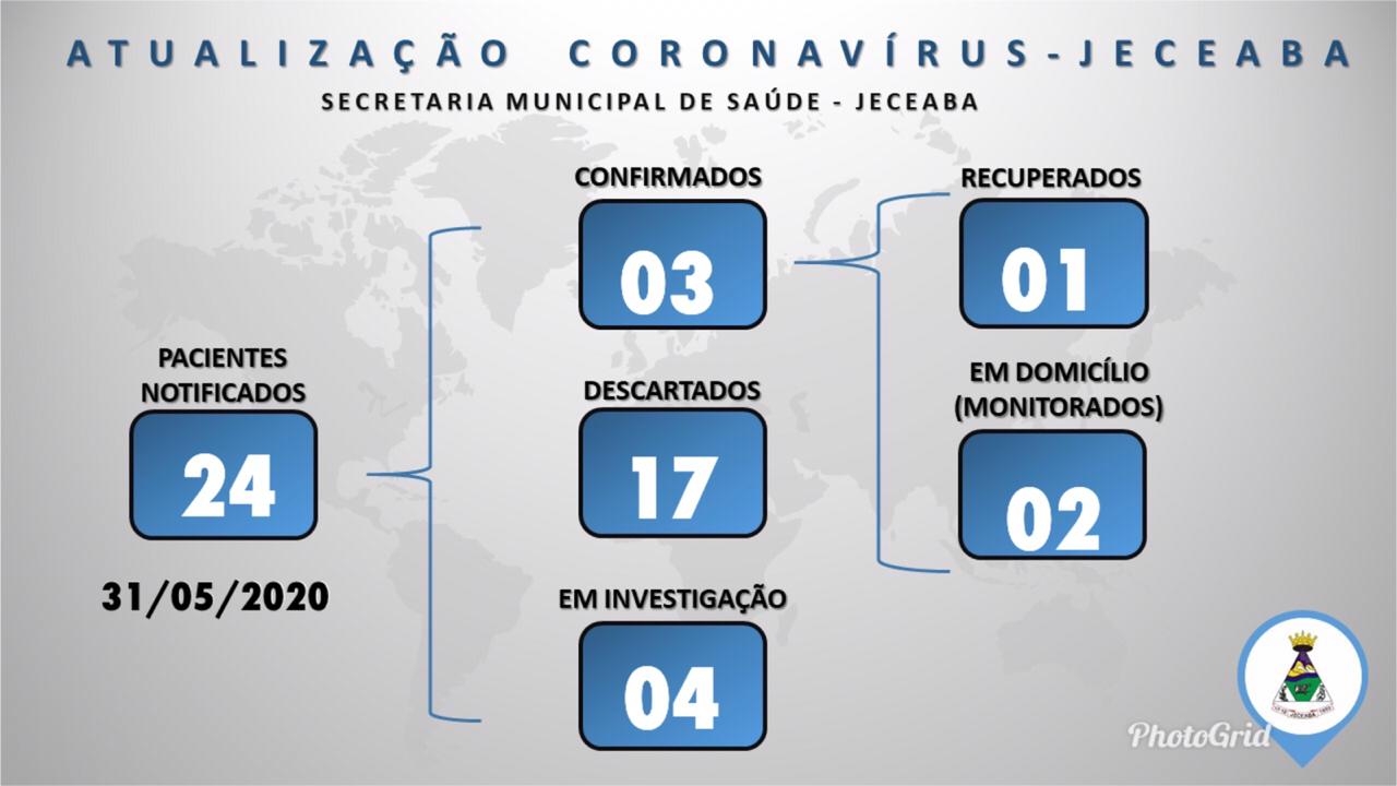 Em Jeceaba a população segue em alerta. Até 31 de maio, já eram três os casos confirmados de Covid-19: dois em monitoramento e um já considerado recuperado. 17 casos notificados já estão descartados e outros 4 seguem em investigação.