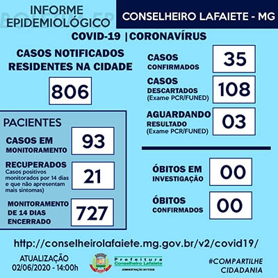 A secretaria de Saúde emitiu novo boletim epidemiológico neste dia 2 de junho informando que passaram de 800 as notificações de suspeitas de coronavírus na cidade. Dos 806, estão em monitoramento 93 casos, em que 14 testaram positivo para o vírus. As outras 21 pessoas que também foram diagnosticadas com o vírus já são consideradas recuperadas, já que não apresentam sintomas após monitoramento de 14 dias. Entre os descartados, constam 727. Não há óbitos em investigação, nem confirmados na cidade. Três pessoas aguardam resultado do exame de PCR realizado na Fundação Ezequiel Dias (Funed), em Belo Horizonte.