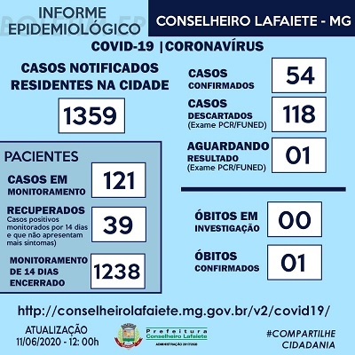 Lafaiete já notificou 1.359 casos suspeitos de paciente com novo Coronavírus. Destes, 1.238 tiveram o monitoramento de 14 dias encerrado, 118 foram descartados por exame e 121 ainda estão em monitoramento.