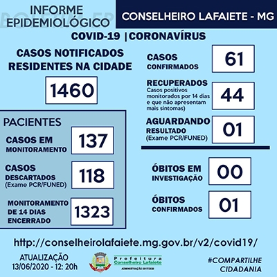 A prefeitura de Lafaiete informou neste sábado, 13 de junho, a confirmação de quatro novos casos de Coronavírus na cidade. De acordo com nota, os pacientes seguem em monitoramento e isolamento domiciliar.
