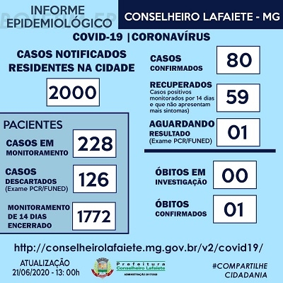 A Prefeitura de Conselheiro Lafaiete informou neste domingo, 21 de junho, que, ao too, 2.000 casos suspeitos de Coronavírus foram notificados em Lafaiete até esta data. Ainda segundo dados da Prefeitura, 228 casos ainda seguem em monitoramento, 1772 tiveram o monitoramento encerrado e 126 foram descartados por exame. Não há confirmação de novos casos.