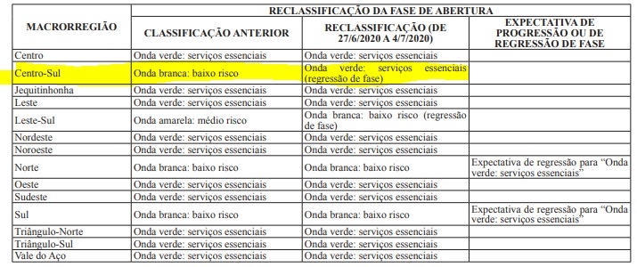 Onda Verde - agropecuária; alimentos; bancos e seguros; cadeia produtiva e atividades assessórias essenciais; construção civil e afins; fábrica, energia, extração, produção, siderúrgica e afins; saúde; telecomunicação, comunicação e imprensa; transporte, veículos e correios; tratamento de água, esgoto e resíduos; hotéis e afins.