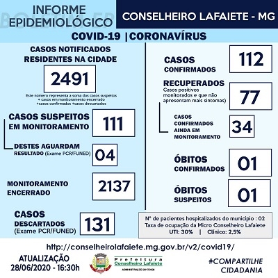 Há na cidade 112 casos confirmados, destes 77 já estão recuperados. Quatro pacientes aguardam exame da Funed. Um óbito foi confirmado e um segue em investigação.