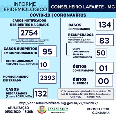 O boletim de hoje ainda informou que há três pacientes hospitalizados no município, sendo assim a taxa de ocupação da Micro Região de Lafaiete na UTI de 40% e em leitos clínicos de 7,5%.