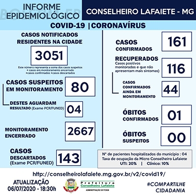 O boletim de hoje ainda informou que há quatro pacientes hospitalizados no município, sendo assim a taxa de ocupação da Micro Região de Lafaiete na UTI de 20% e em leitos clínicos de 10%.