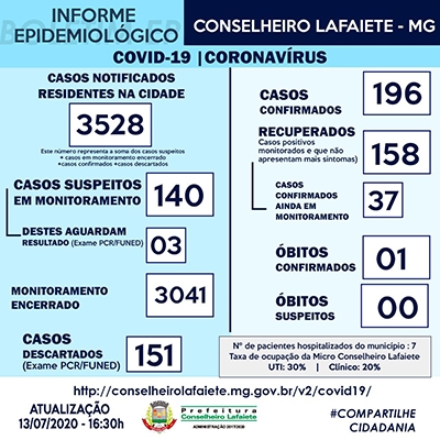 A secretaria de Saúde de Lafaiete registrou hoje, 13 de julho, três novas confirmações de casos positivos para coronavírus. Com as atualizações, a cidade chega ao total de 196 casos confirmados. 158 já são considerados recuperados depois de cumprirem isolamento social, serem monitorados durante 14 dias e já não apresentarem mais sintomas.