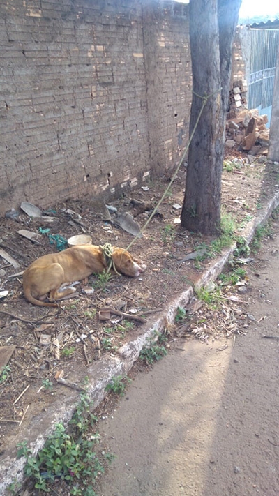 No local, os militares verificaram se tratar de um cão mestiço da raça pitbull, que estava amarrado por uma corda em uma árvore. Os bombeiros colocaram o animal em uma gaiola apropriada, acionando funcionários do Canil Municipal, que se responsabilizaram pelo animal.