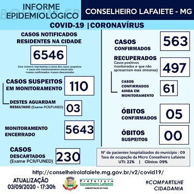 A Prefeitura de Lafaiete, por meio da Secretaria Municipal de Saúde e do Serviço de Epidemiologia, informa que até as 17h desta quinta-feira, dia 3 de setembro, cinco novos casos de Coronavírus haviam sido confirmados. Ao todo, a cidade tem 563 casos positivos.