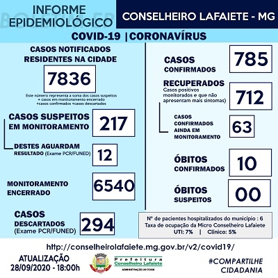 A prefeitura de Lafaiete, por meio da secretaria municipal de Saúde e do serviço de Epidemiologia, informou que até as 18h desta segunda-feira, dia 28 de setembro, seis novos casos de coronavírus foram confirmados. Ao todo, a cidade tem 785 moradores residentes em Lafaiete, contaminados.