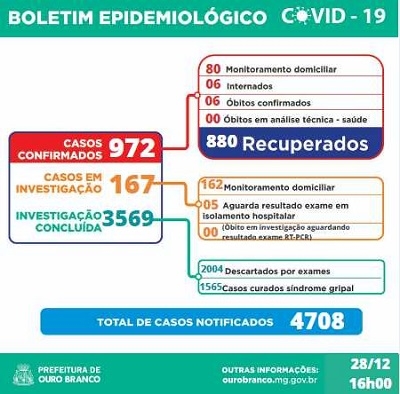 Ouro Branco, nesta segunda-feira, 28 de dezembro, registrou seis novos casos de coronavírus nas últimas 24 horas, segundo a secretaria de Saúde, totalizando 972 positivos. Estão em investigação 162 casos que permanecem em monitoramento domiciliar.