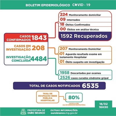Entre os confirmados, 224 estão em monitoramento domiciliar e 1.592 estão recuperados da doença. Nove pacientes estão internados na Rede Hospitalar de Ouro Branco.