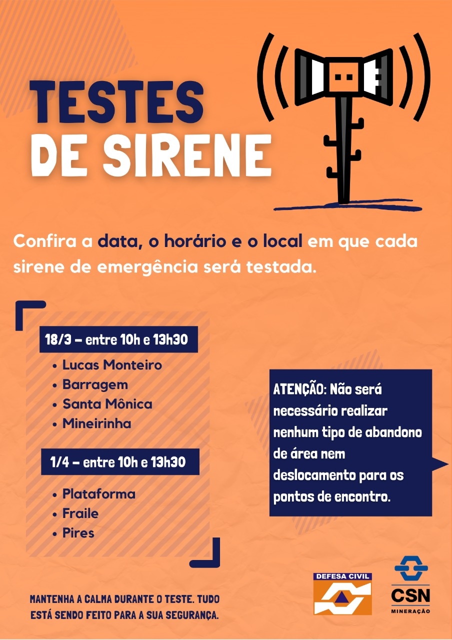 Para verificar eventuais ajustes e pontos de aperfeiçoamento, a prefeitura de Congonhas e a CSN Mineração realizarão dois testes de sirene. Os procedimentos estão agendados para os dias 18 de março e 1º de abril, entre 10h e 13h30. A Defesa Civil do município alerta à população que os testes visam, basicamente, avaliar a eficiência das sirenes para casos de emergência. Portanto, não será necessário realizar nenhum tipo de abandono da área ou deslocamento para os pontos de encontro.