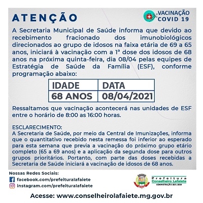 A prefeitura informou, em nota, que, como a remessa veio em quantidade menor do que o esperado, não é possível vacinar o grupo etário completo (65 a 69 anos). Por essa razão, a partir de amanhã, idosos com 68 anos receberão a dose nas unidades de postos de saúde, das 8h às 16h.