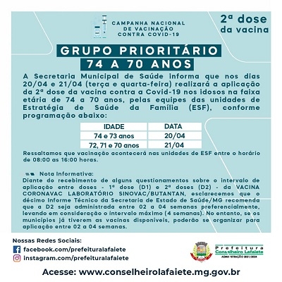A prefeitura comunicou hoje que a Secretaria Municipal de Saúde começará a aplicação da segunda dose da vacina contra a Covid-19 em idosos na faixa etária de 70 a 74 anos neste terça e quarta-feira, 20 e 21 de abril. O procedimento será feito nas unidades de Estratégia de Saúde da Família (ESF) de 8h às 16h, de acordo com o cronograma: