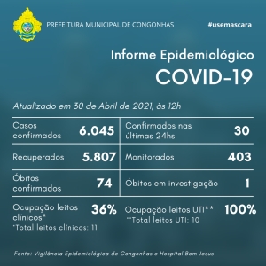 A Secretaria Municipal de Saúde atualizou os dados sobre a evolução da pandemia em Congonhas. Mais 30 pessoas contaminadas com coronavírus foram confirmadas nas últimas 24 horas, totalizando 6.045 casos registrados. Já são 5.807 recuperados da doença e 403 permanecem em monitoramento. Os leitos de UTI continuam com a taxa máxima de ocupação de sua capacidade e os clínicos reduziram para 36%.