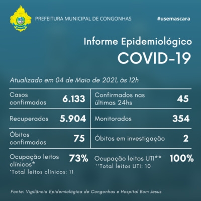 Conforme as informações divulgadas pelo boletim epidemiológico de Congonhas desta terça-feira, 4 de maio, a cidade confirmou 45 novos casos e mais uma morte por Covid-19. Ao todo, já foram registradas 6.133 pessoas infectadas pelo coronavírus, das quais 5.904 recuperaram, 354 permanecem em monitoramento e 75 morreram.