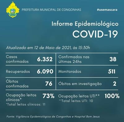 A Secretaria Municipal de Saúde informa que, até às 15h30 desta quarta-feira, 12 de maio, 6.352 casos de Covid-19 haviam sido confirmados em Congonhas. Deste total, 6.090 pacientes já receberam alta. Foram confirmados 38 novos casos nas últimas 24 horas e 511 estão sendo monitorados.