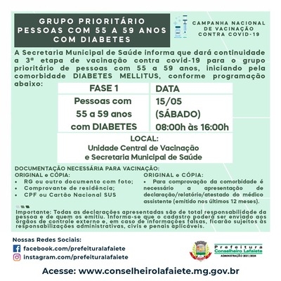 A Secretaria Municipal de Saúde informa que dará continuidade à terceira etapa de vacinação contra Covid-19 para o grupo prioritário de pessoas com 55 a 59 anos, iniciando pela comorbidade diabetes mellitus. A vacinação acontecerá neste sábado, 15 de maio, das 8h às 16h, na Unidade Central de Vacinação e Secretaria Municipal de Saúde.