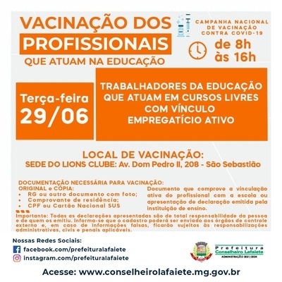 Amanhã, 29 de junho, das 8h às 16h, os trabalhadores da Educação que atuam em cursos livres com vínculo empregatício ativo serão vacinados contra a Covid-19 em Conselheiro Lafaiete. A imunização será na sede do Lions Clube, localizada na Avenida Dom Pedro II, número 208, bairro São Sebastião.