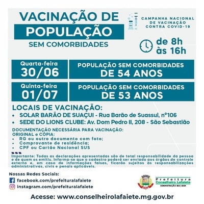 No dia 30 de junho, quarta-feira, pessoas de 54 anos sem comorbidades serão vacinadas contra a Covid-19 em Lafaiete. Já na quinta-feira, 1º de julho, será a vez de quem tem 53 anos.