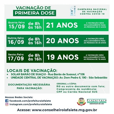 O calendário de vacinação contra a Covid-19 nos próximos dias já está disponível. Na próxima quarta-feira, 15 de setembro, jovens de 21 anos receberão a primeira dose. Na quinta, 16, e sexta-feira, 17 de setembro, adolescentes de 20 e 19 anos também serão vacinados, respectivamente. A vacinação será exclusivamente para pessoas das faixas etárias selecionadas.
