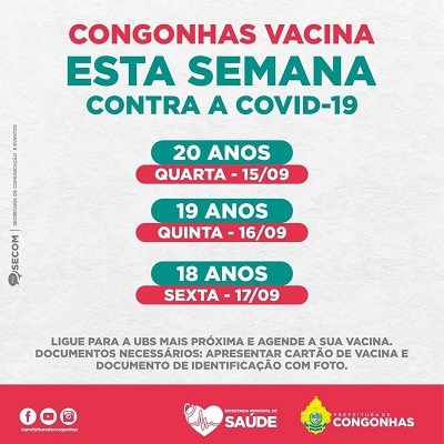 A prefeitura de Congonhas anunciou a programação de vacinação por agendamento até sexta-feira, 17 de setembro: