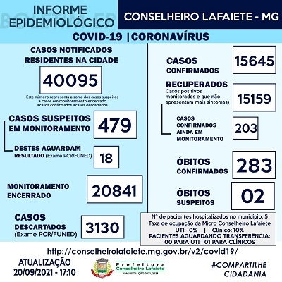 A Secretaria Municipal de Saúde e o Serviço de Epidemiologia confirmam 27 novos casos de Covid-19 em Conselheiro Lafaiete, nesta segunda-feira, 20 de setembro. Ao todo, são 15.645 registros de infecções pelo Coronavírus, sendo 15.159 recuperados. Com 203 quadros em monitoramento e cinco internações. São 283 vítimas fatais das complicações da doença. Dois óbitos estão em análise.