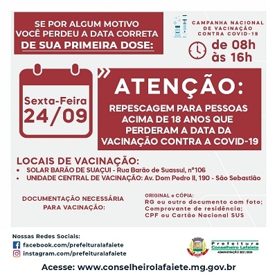 A Secretaria de Saúde divulgou o calendário para repescagem de pessoas acima de 18 anos que, por alguma razão, perderam a aplicação da primeira dose da vacina contra a Covid-19. A aplicação será feita na próxima sexta-feira, 24, e no sábado, 25 de setembro. Não se esqueça de apresentar os originais e cópia do documento de identificação com foto, comprovante de residência e cartão do SUS ou CPF.
