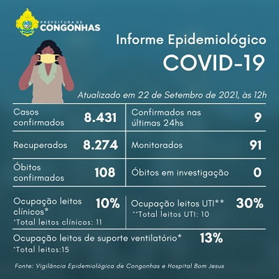 A Secretaria Municipal de Saúde de Congonhas divulgou nesta quarta-feira, 22 de setembro, 9 novos casos de Covid-19. A cidade totaliza, então, 8.431 pessoas infectadas desde o início da pandemia. Deste total, 8.274 pacientes já receberam alta. Outros 91 estão em monitoramento.