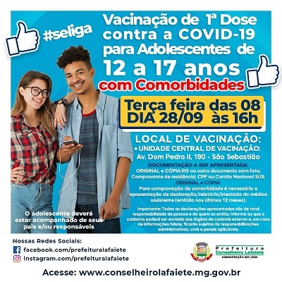 Para receber a primeira dose, os jovens devem estar acompanhados dos pais ou responsáveis. É obrigatório apresentar os originais e cópias de RG ou outro documento com foto, comprovante de residência, CPF ou cartão do SUS. A comprovação da comorbidade será feita mediante apresentação de declaração, relatório ou atestado do médico emitido nos últimos 12 meses.