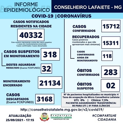 A Secretaria Municipal de Saúde e o Serviço de Epidemiologia confirmam cinco novos casos de Covid-19 em Conselheiro Lafaiete, neste sábado, 25 de setembro. Ao todo, são 15.712 registros de infecções pelo Coronavírus, sendo 15.311 recuperados. Com 118 quadros em monitoramento e apenas quatro internações. São 283 vítimas fatais das complicações da doença. Dois óbitos estão em análise.