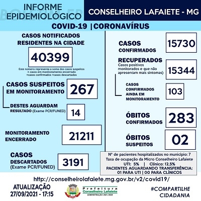 A Secretaria Municipal de Saúde e o Serviço de Epidemiologia confirmam 17 novos casos de Covid-19 em Conselheiro Lafaiete, nesta segunda-feira, 27 de setembro. Ao todo, são 15.730 registros de infecções pelo Coronavírus, sendo 15.344 recuperados. Com 267 quadros em monitoramento e sete internações. São 283 vítimas fatais das complicações da doença. Dois óbitos estão em análise.