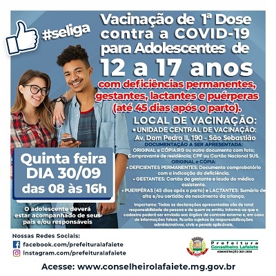 Vacinação de adolescentes de 17 anos. É obrigatório apresentar os originais e cópias do documento de identificação com foto, comprovante de residência e CPF ou cartão do SUS. O adolescente precisa estar acompanhado dos pais ou responsáveis. Locais: