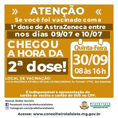 Segunda dose para pessoas vacinadas com AstraZeneca entre os dias 9 e 10 de julho.É indispensável a apresentação do Cartão de Vacinação, Cartão Nacional do SUS ou CPF. Locais:
